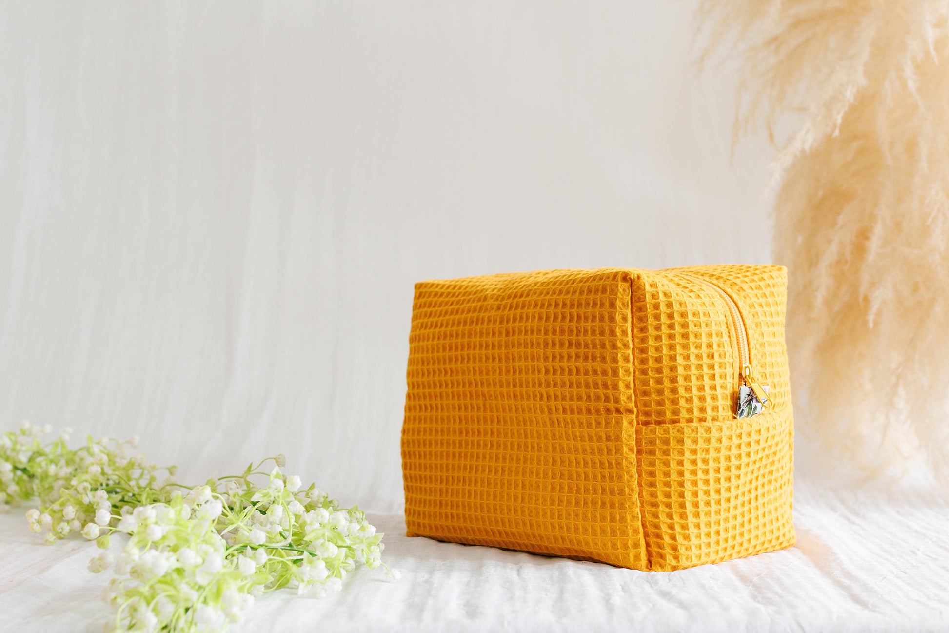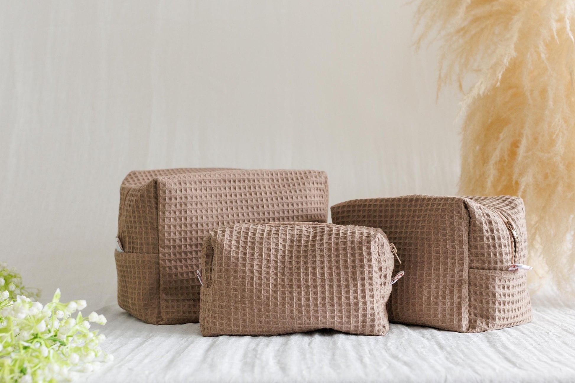 Waffle Fabric Makeup Bags (Set) These storage bags are made from soft waffle-textured fabric and come in different sizes for easy organization. They have a simple rectangular shape and a zip closure, making them practical for storing toiletries, baby items, cosmetics, or small travel essentials. The neutral color fits well with many styles, and the bags are lightweight and easy to carry. Suitable for everyday use at home or when traveling.